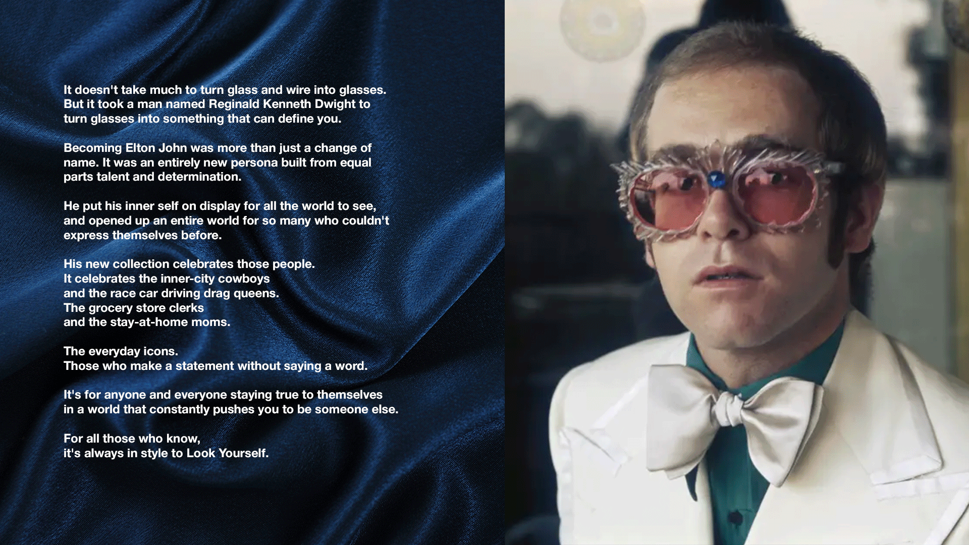 In collaboration with Elton John and David Furnish, we created the brand identity and launched Elton John Eyewear with Look Yourself—a campaign celebrating the power of self-expression and the confidence to define who you are..
