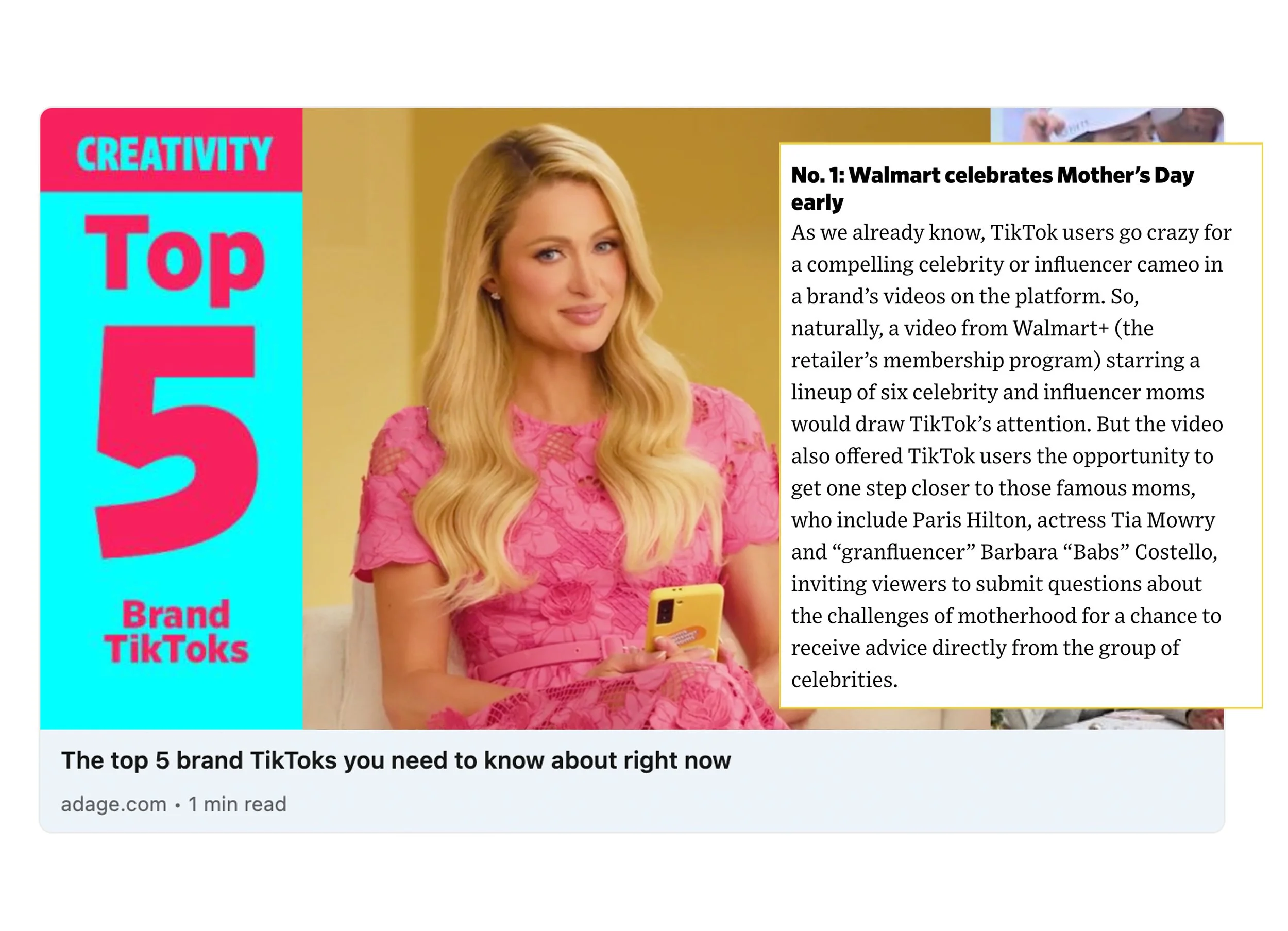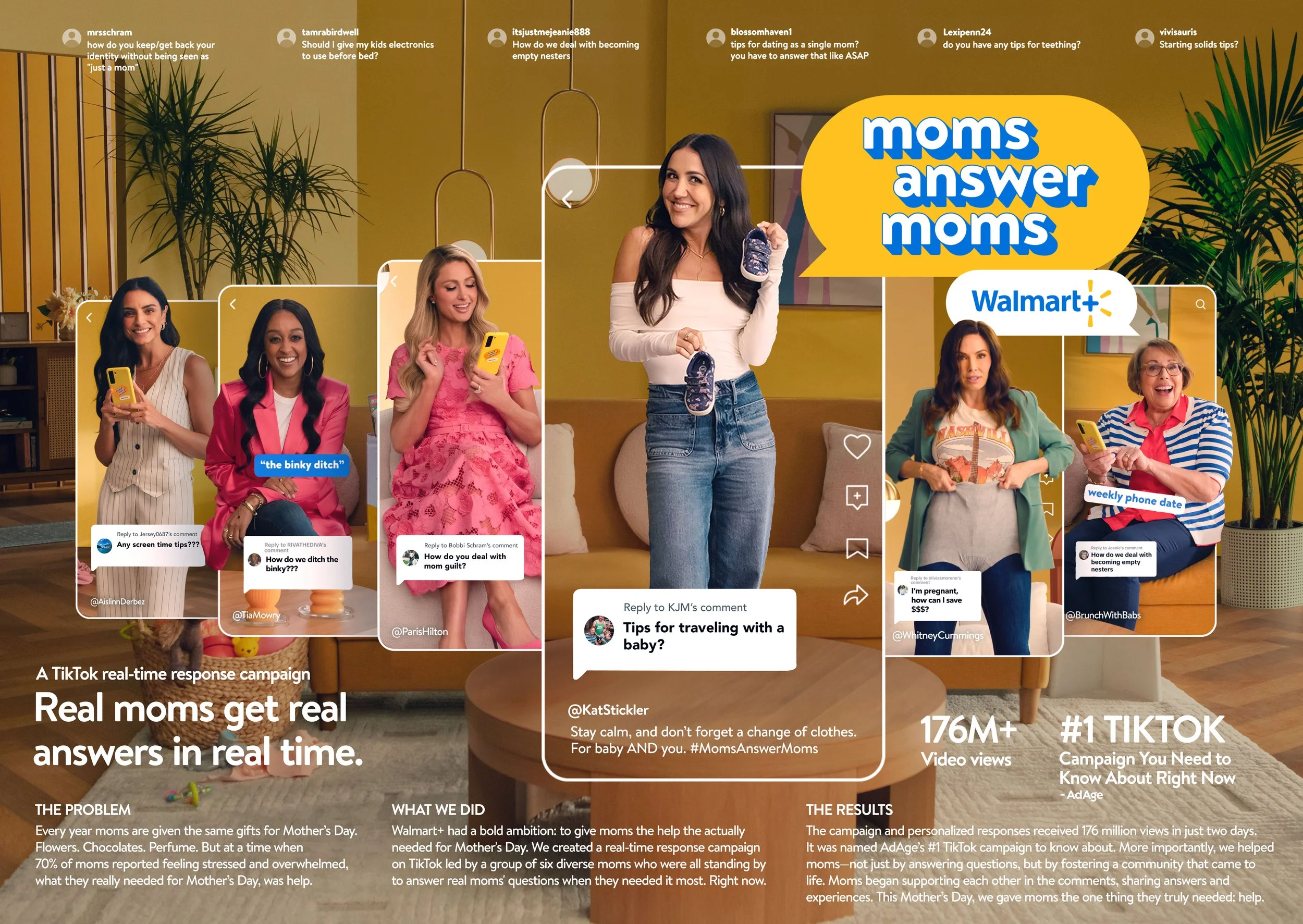 For Mother's Day, Walmart gave moms what they really needed: help. We created “Moms Answer Moms” a real-time TikTok campaign where a diverse team of famous moms - Paris Hilton, Whitney Cummings, Tia Mowry, Kat Stickler, Aislinn Derbez, and Babs Costello — answered honest questions from real moms with personalized mom hacks.